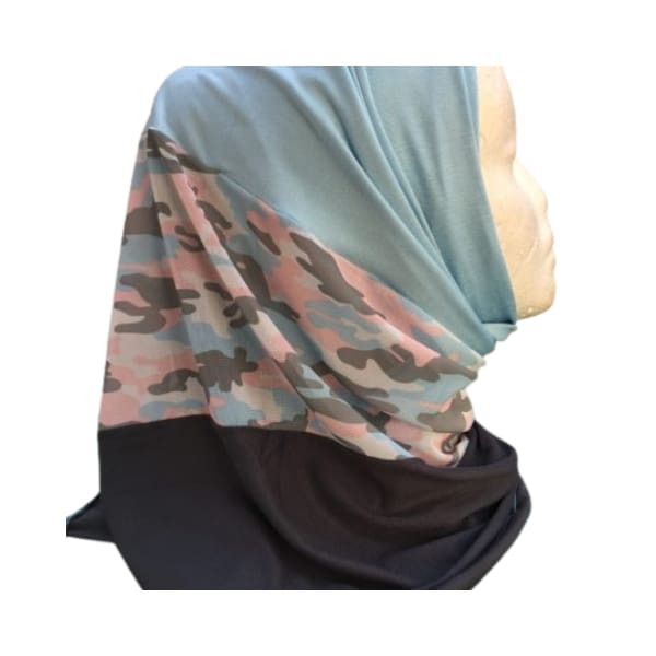 Pastel blue pin free kids scarf with animal print, approximately 138 cm x 53 cm. Easy pull on style with no pins needed, designed for comfort and quick modest coverage.