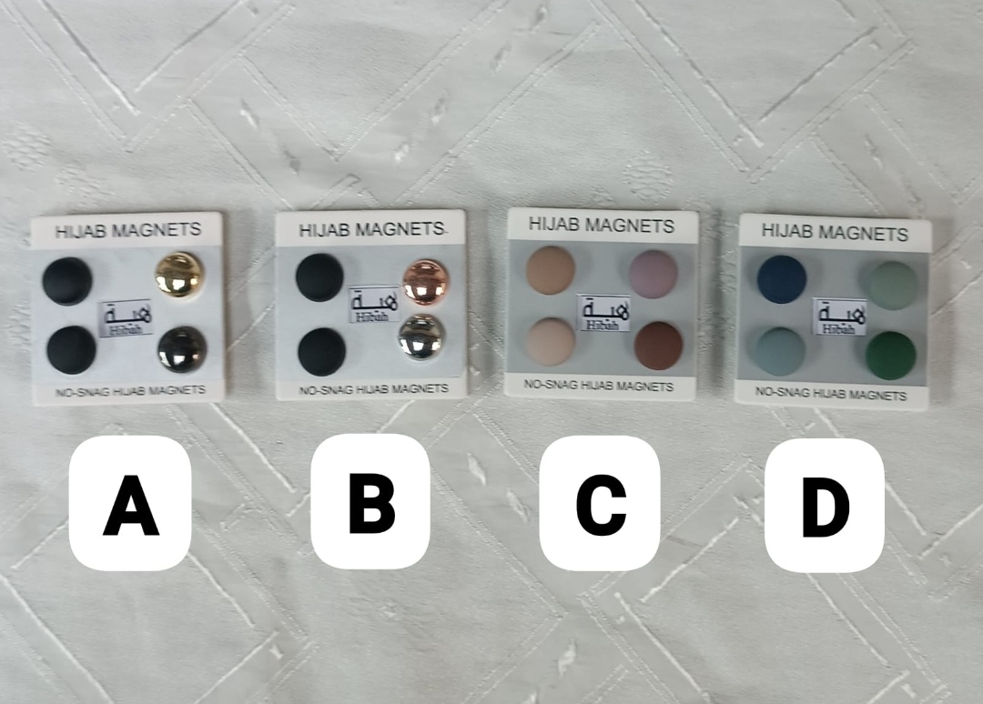 Our no - snag hijab magnets provide a secure hold for your hijab with their strog magnetic force. Available in the following sets :