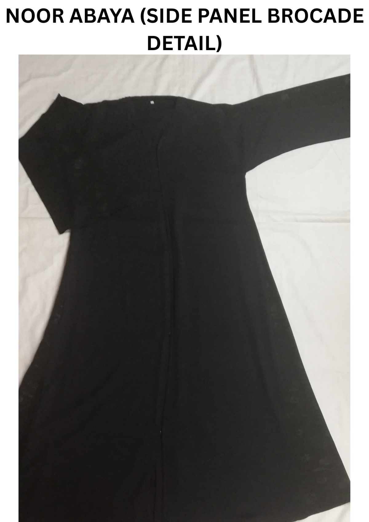 Beautiful plain black Nida Fabric abaya with brocade black on black side panel inserts giving a classic drape finish!